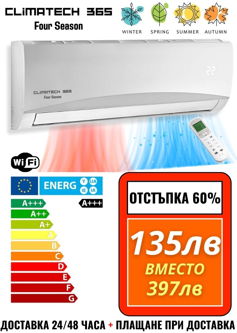 Патентовано сплит устройство 4 в 1, което ОТОПЛЯВА, ОХЛАЖДА, ПРЕЧИСТВА с висока енергийна ефективност и намалява сметките ти до 80% както през лятото, така и през зимата.