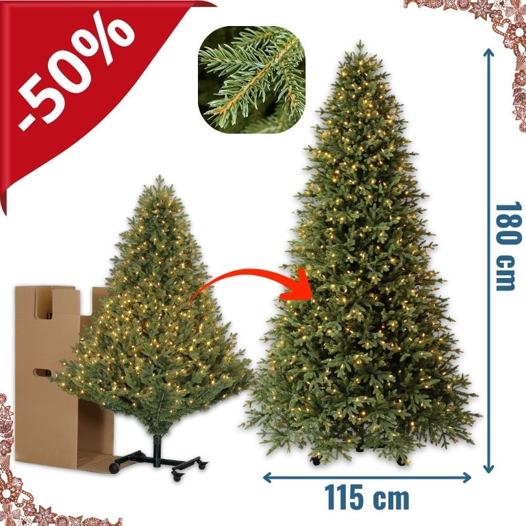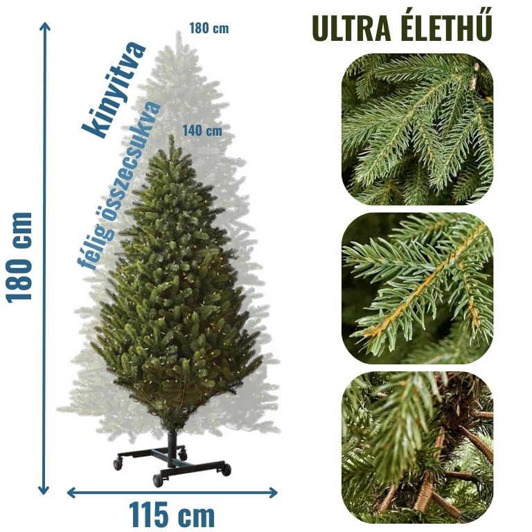 Szilárd és elegáns talppal rendelkezik, erős ágai néhány másodperc alatt kinyílnak, így bármilyen környezethez tökéletesen illik. Az összeszerelése gyors, a valósághű ágak megkönnyítik a díszítést, és a kiváló minőségű anyagoknak köszönhetően természetes megjelenését sokáig megőrzi, majd az ünnepek után könnyedén elpakolható.