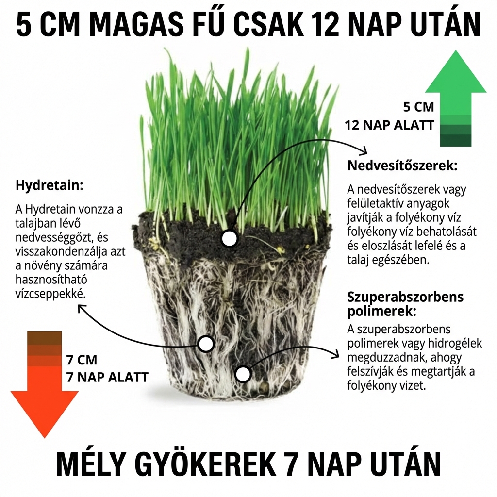Gyakran a vetett fű szépnek tűnik, de könnyen tönkremegy a taposástól. A Hydro Fast Plus speciális magjai mélyen nőnek, nem pedig magasan. Az eredmény? Erős és ellenálló gyökerek és egyenletes magasságú gyep, amely nem igényel folyamatos igazítást vagy nyírást!