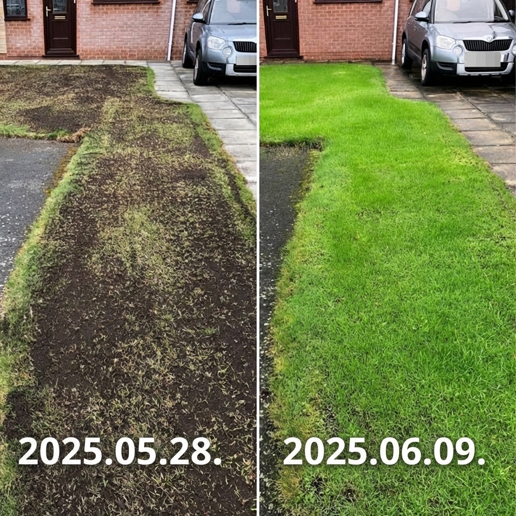 Pár perc alatt permeteztem, és körülbelül egy hét múlva már láttam az első fűszálakat, és nem hittem a szememnek (10°C volt azokban a napokban). Rövid idő alatt a gyep sűrűbb, zöldebb és egyenletesebb lett még a legrosszabb állapotú területeken is.