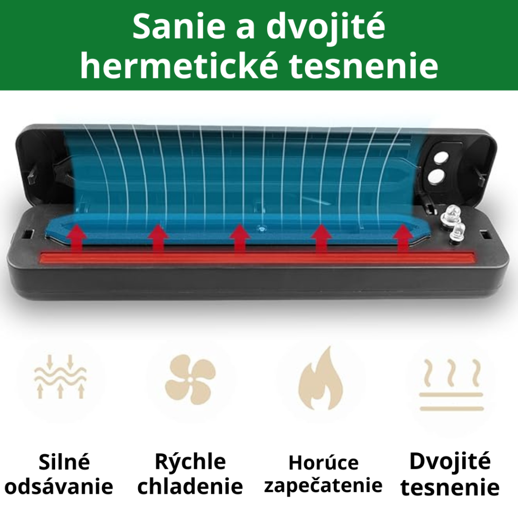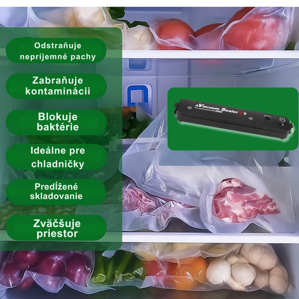 Vďaka svojej saciej sile a dvojitému hermetickému uzáveru zostávajú potraviny chránené pred vzduchom, baktériami a spálením mrazom.